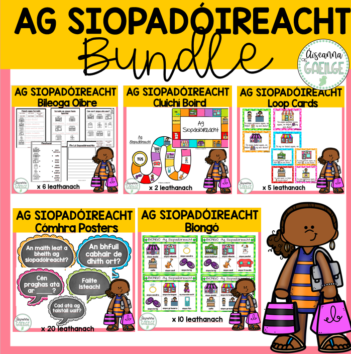 Ag Siopadóireacht is one of my favourite topics to teach. Pre-covid the children would take in dress-up clothes and there is also great opportunity for integration in maths with the strand of money and through Aistear. I usually stay on the theme of ‘Ag Siopadóireacht’ for a fortnight-a month. In this blog post I will outline ideas and strategies to help with your teaching of ‘Ag Siopadóireacht’ as well as some integration ideas.